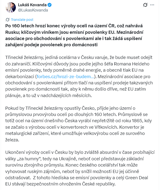 K postu mě přivedl - ne poprvé - dramatický post Lukáše Kovandy na Twitteru, dle kterého “hrozí konec výroby oceli v ČR”, a to samozřejmě vinou perfidní politiky Evropské unie, která si přece dala za cíl zlikvidovat evropský průmysl. (Viz screenshot). Tak jsem se do evropského ocelářství - protože o to tu jde a je to důležité téma - trochu zahloubal.